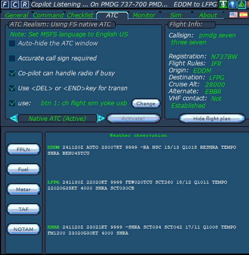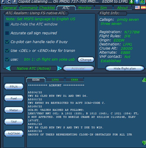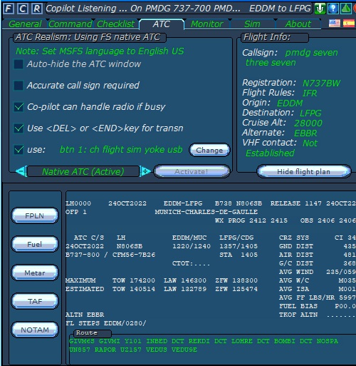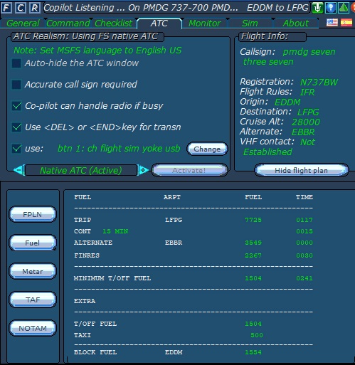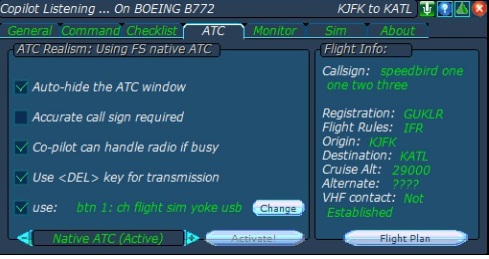 The ATC page, for selecting the options you think are better for you. Note the possibility of using a joystick button, as a push to talk button, for message transmission. So, it is time to get away from those bad habits, of reaching out for the keyboard to interact with ATC!