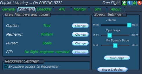 The Command page, where you can select one of the installed voices to use for crew members. Choose from 7 recorded high quality voice packs, including English US, UK, Australian, German, and French accents.