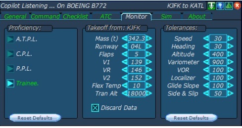 The monitor page, where you can specify the proficiency level you are seeking, and set some operational parameters.